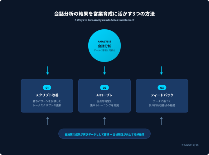 会話分析の真価は、データを集めることではなく、分析結果を育成の仕組みに組み込む段階で発揮されます。ここでは、スクリプト改善・ロープレ・フィードバックの3つの活用法を解説します。