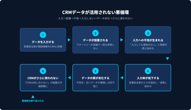 従来はCRMへの入力を義務化すれば定着すると考えられてきましたが、実際にはデータを使う場面がなければ入力は確実に形骸化します。営業担当者が30分かけて入力したデータを、マネージャーが一度も参照しなければ「入力する意味がない」と判断されるのは当然です。