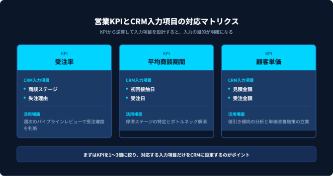 具体的には、自社の営業KPIを3つ以内に絞り、各KPIに対応するCRM入力項目を1対1で紐づけます。たとえば「受注率」をKPIにするなら、CRMには「商談ステージ」と「失注理由」の2項目さえ入力されていれば算出可能です。