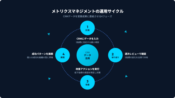 メトリクスマネジメントの運用は、「計測→振り返り→改善→再現」の4フェーズサイクルで回します。CRMにデータを入力する「計測」はすでに前述の5ステップでカバーしています。残りの3フェーズを定着させることで、CRMのデータが営業成果に直結する仕組みが完成します。