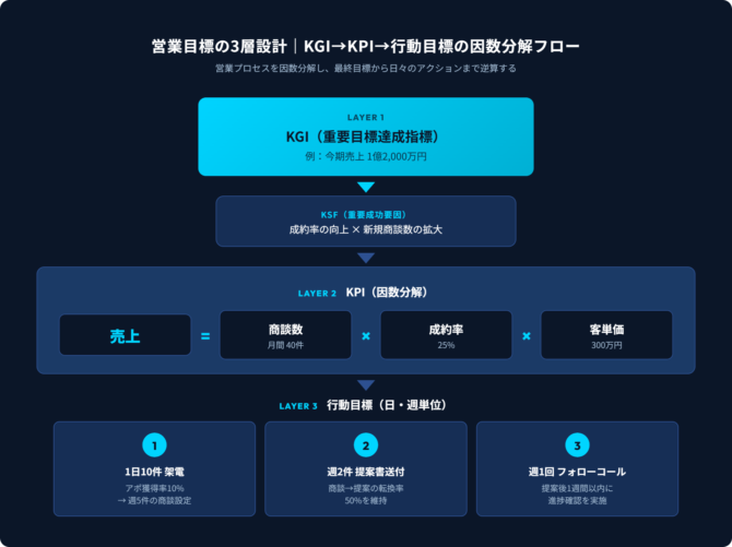 従来の営業目標設定は「前年比〇〇%増」のようにトップダウンの数字を割り振る方法が主流でした。しかし現在は、最終ゴール(KGI)を起点に、中間指標(KPI)と日々の行動目標を因数分解で接続する「3層設計」が、再現性の高い目標設定の方法として定着しつつあります。