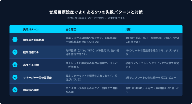 正しい設定手順を知っていても、現場では同じ失敗が繰り返されがちです。ここでは、営業組織で特に多い5つの失敗パターンと、それぞれの対策を整理します。