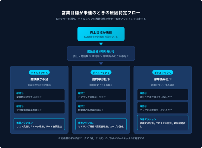 まずはKPIツリーを遡って、ボトルネックがどこにあるかを特定してください。「商談数が足りないのか」「成約率が落ちているのか」「客単価が下がっているのか」を因数分解の構造に沿って切り分ければ、打つべき手が明確になります。行動量だけを増やしても、ボトルネックが質の問題であれば成果は改善しません。