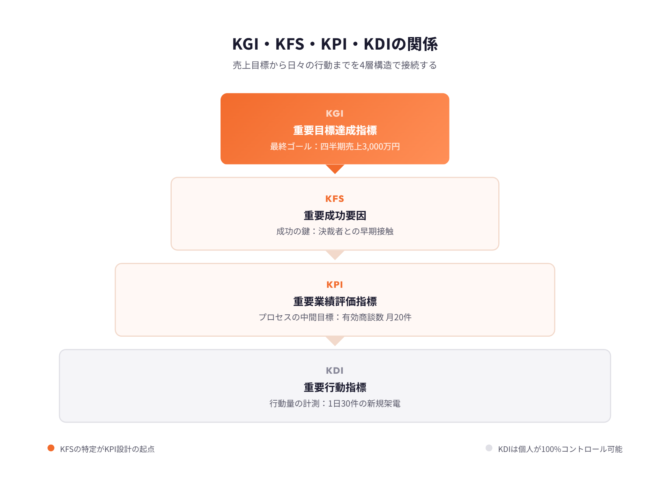 営業KPIは、売上というゴール(KGI)へ向かう途中のチェックポイントとして機能します。KGIを頂点に、KFS(重要成功要因)・KPI(重要業績評価指標)・KDI(重要行動指標)の4つの指標が連動して初めて、目標達成の道筋が構造的に可視化されます。