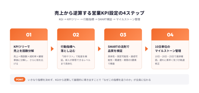 効果的な営業KPIは、売上目標(KGI)から逆算して論理的に導き出すものです。「訪問数を追おう」といきなり指標を決めるのではなく、全体像を把握してから個人の行動レベルまで細分化する4つのステップで設計します。
