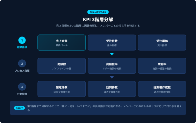 分解苦手タイプの克服には、売上目標を3つの階層に因数分解するKPI3階層分解のフレームワークが有効です。数字が「塊」のまま見えていると打ち手が出てこないのは当然であり、階層ごとに分けることで初めて具体的なアクションにつながります。