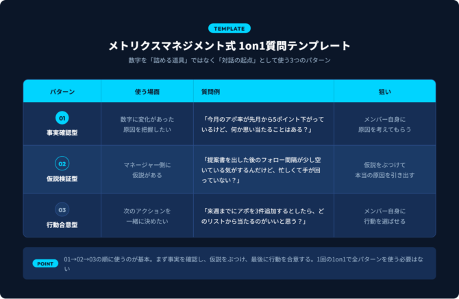数字を対話の起点にするといっても、具体的にどう話を切り出せばよいかがわからないという声は多くあります。ここでは、1on1の場面ですぐに使えるメトリクスマネジメント式1on1質問テンプレートを3つのパターンで紹介します。