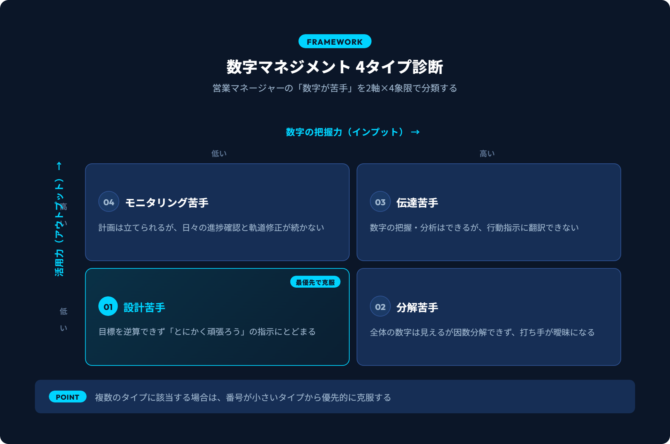 営業マネージャーが数字管理に苦手意識を持つ原因は、大きく「設計」「分解」「伝達」「モニタリング」の4タイプに分類できます。自分がどのタイプに該当するかを特定することが、最短の克服ルートになります。