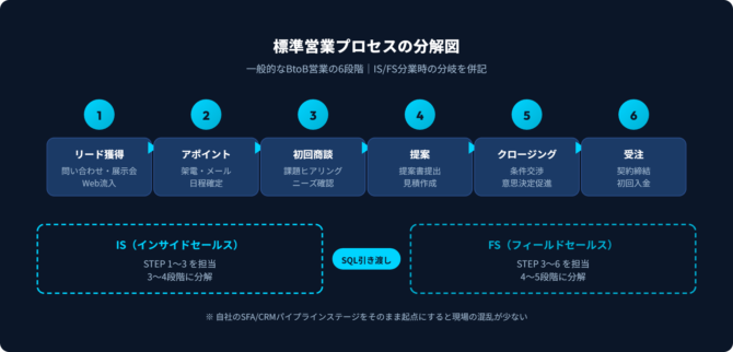 BtoBのフィールドセールスであれば6〜8段階、インサイドセールスとの分業型では、IS側3〜4段階・FS側4〜5段階に分かれるケースが一般的です。自社でSFA/CRMのパイプラインステージが設定済みなら、そのステージ定義をそのまま起点にすると現場の混乱が少なく済みます。