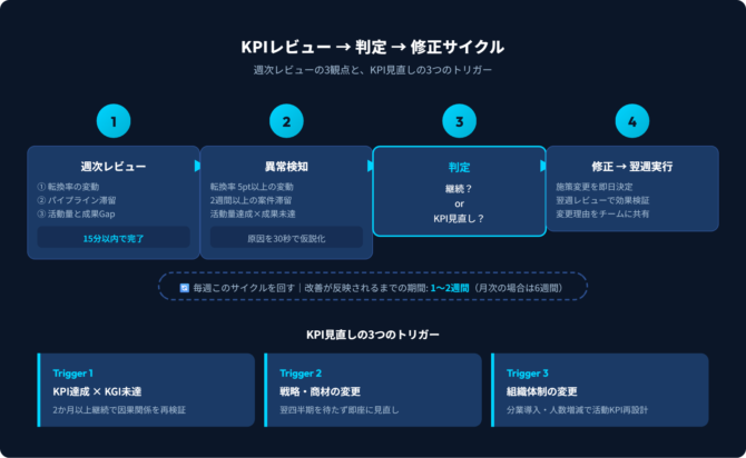 週次KPIレビューでは「転換率の変動」「パイプラインの滞留」「活動量と成果のギャップ」の3つを15分以内で確認する運用が、定着率の分かれ目になります。レビューの時間が長いほど形骸化が早まるため、議題を3観点に固定して短時間で回すことが鍵です。