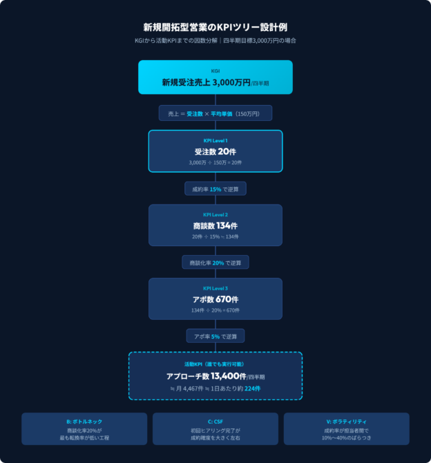 具体的なKPIツリーの例を示します。KGIが四半期新規受注3,000万円、平均単価150万円の場合、必要受注数は20件です。成約率15%で逆算すると必要商談数は約134件。商談化率20%なら必要アポ数は670件。アポ率5%なら必要アプローチ数は13,400件になります。