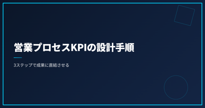 営業プロセスKPIの設計は、①KGIの因数分解→②3軸でのKPI選定→③活動KPIへの落とし込み、の3ステップで進めます。この順序を飛ばして「とりあえず訪問件数をKPIにする」設計をすると、現場は動いているのに数字が伸びない状態に陥ります。