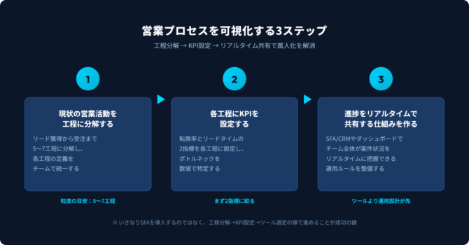 営業プロセスの可視化は、「①工程分解→②KPI設定→③リアルタイム共有」の3ステップで進めます。可視化の対象は「行動」と「指標」の2軸であり、どちらか一方だけでは改善アクションにつながりません。