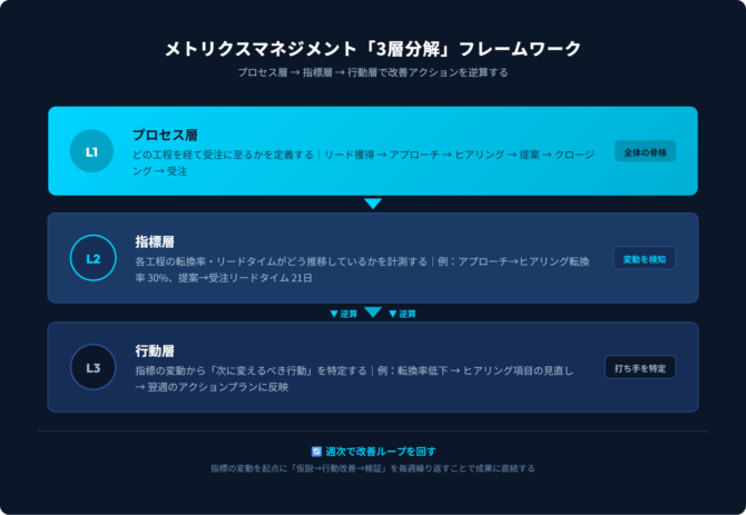 メトリクスマネジメントの3層分解とは、営業活動をプロセス層・指標層・行動層の3つに分け、指標の変動から具体的な行動改善を逆算するフレームワークです。プロセス層は「どの工程を経て受注に至るか」、指標層は「各工程の転換率やリードタイムがどう推移しているか」、行動層は「数値を動かすために担当者が取るべきアクションは何か」を定義します。