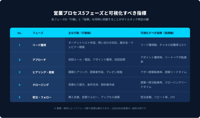 営業プロセスの可視化で見るべき対象は、「行動」と「指標」の2軸です。行動とは各工程で営業担当者が実際に行うアクションの量や内容を指し、指標とは工程間の転換率やリードタイムなど成果に直結する数値を指します。