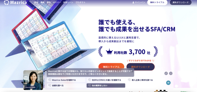 入力負担の少なさをSFA定着の鍵と位置づけ、直感的なUIで現場の利用率向上を追求しています。音声入力を直接搭載しているわけではありませんが、外部の文字起こしサービスと連携させれば音声→テキスト→SFAの流れを構築できます。SFAの選定と音声入力の導入をセットで検討している中堅企業に適しています。