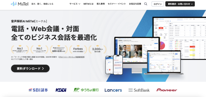 MiiTelは株式会社RevCommが提供するAI搭載型IP電話サービスです。電話営業の通話内容を自動で録音・文字起こしし、話速やラリー回数、発話の被り率など複数の指標で会話を分析します。