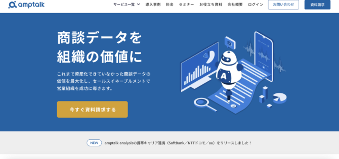 amptalkは商談や電話の録音データを解析し、営業チームのパフォーマンス向上を支援するツールです。ZoomやMicrosoft Teamsでの商談内容をテキスト化し、AIが自動でSFAに商談サマリーを登録します。