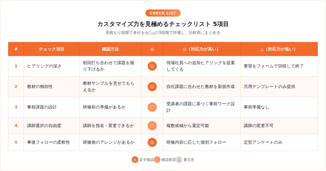この5項目を◎・○・△の3段階で評価し、比較表にまとめると、各社の対応力の差が可視化される。特に「ヒアリングの深さ」は、研修品質を予測する最も信頼性の高い指標だ。初回の打ち合わせで「受講者の日常業務」「直近で困っている場面」まで掘り下げてくる会社は、研修内容の精度が高い傾向がある。