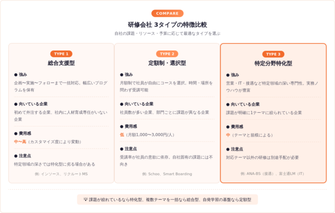 失敗パターンを理解した上で、次は研修会社のタイプ別の特徴を整理し、自社の課題に合ったタイプを絞り込んでいく。