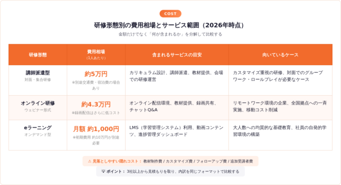 研修会社の費用相場は、講師派遣型で1人あたり約5万円、オンライン研修で約4.3万円、eラーニングで月額約1,000円が2026年時点の目安だ。ただし金額の比較だけでは判断を誤る。同じ「1人5万円」でもカスタマイズやフォローの有無で実質的な価値は大きく異なるため、費用に含まれるサービス範囲まで分解して比較する必要がある。