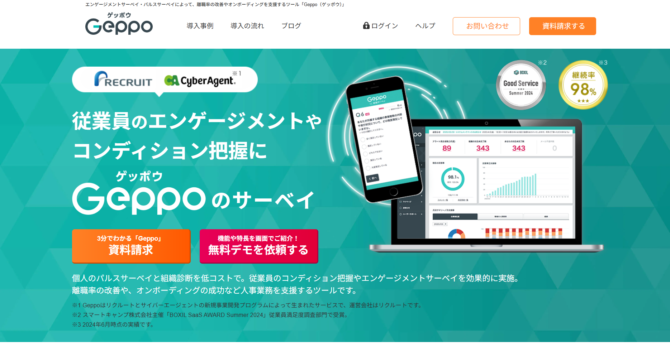 Geppoは、サイバーエージェントとリクルートの共同開発から生まれた月次パルスサーベイツールです。毎月3問の個人パルスサーベイと、四半期ごとの組織サーベイを組み合わせることで、個人と組織の両面からエンゲージメントを継続的にモニタリングできます。月額20,000円〜(25名〜)で利用可能です。