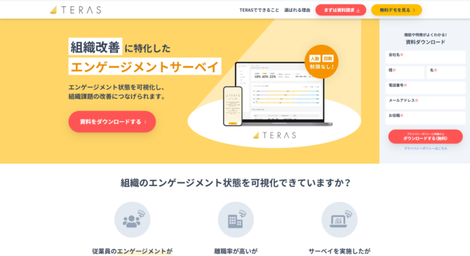 TERASは、組織データをAIが分析し、マネジメント改善のアクションを自動提案するツールです。サーベイ結果・1on1ログ・業績データなどを統合的に解析し、「この部門ではこのアクションを優先すべき」といった具体的なレコメンドを生成します。